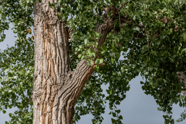 You’ll usually be able to tell the tree by its seeds alone, but if it’s not the right season for this, you’ll be able to identify a cottonwood tree by its broad, ash colored trunk.