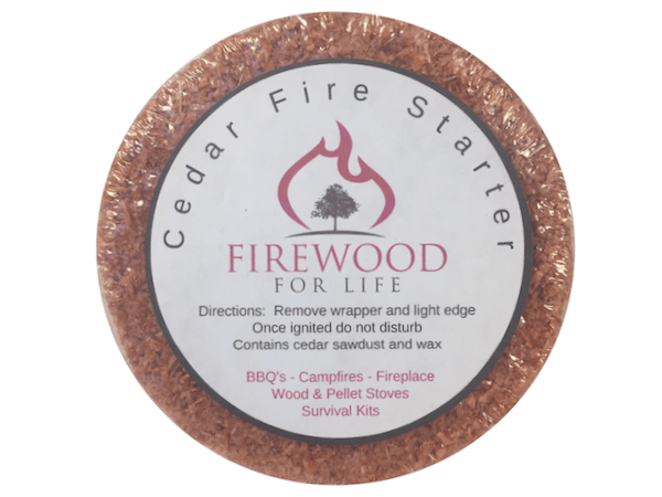 Made from cedar sawdust and highly refined wax, a single disk shaped fire starter will burn for up to 30 minutes.