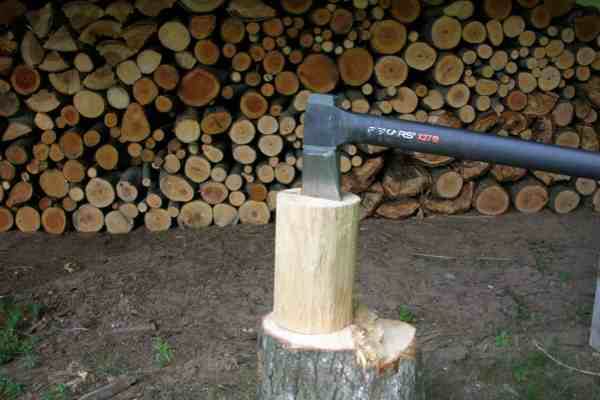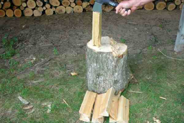 Splitting wood on a splitting block works great because it elevates the wood off the ground which prevents your axe or hatchet from digging into the dirt.