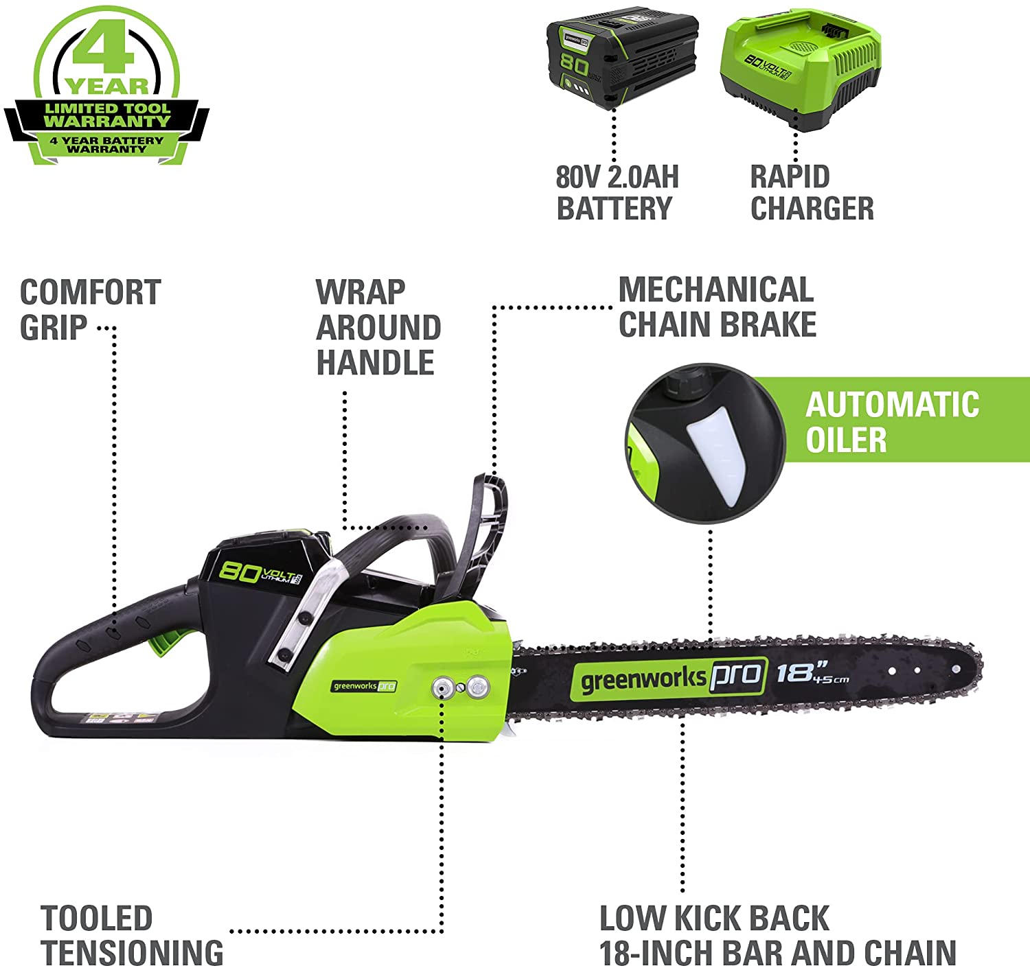 As is the case with many battery-powered chainsaws, Greenworks offers a variety of options related to battery, bar and chain size to fit your individual needs.