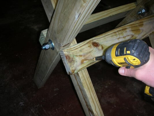 Using the 3 1/2 inch screws, attach a 4 foot 2x4 along the lines of each X.