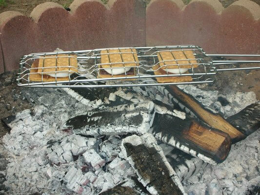 Hold the grill over a hot bed of coals to slowly melt the chocolate and marshmallow.