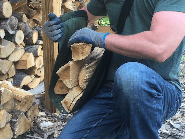 Plus, you put your arm through the sling which helps hold the firewood even closer to your body and hip area.